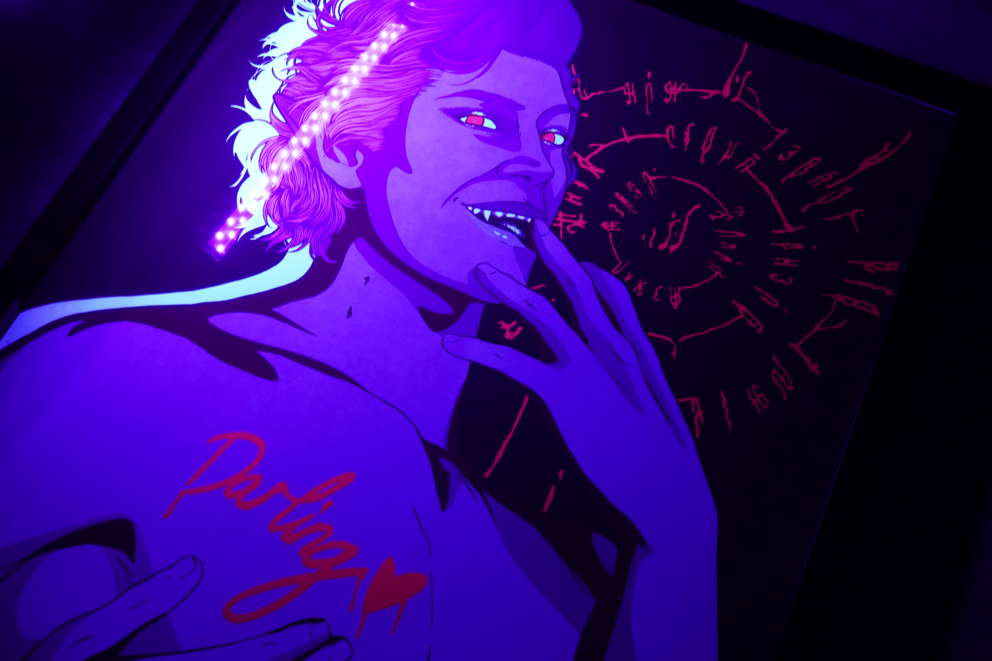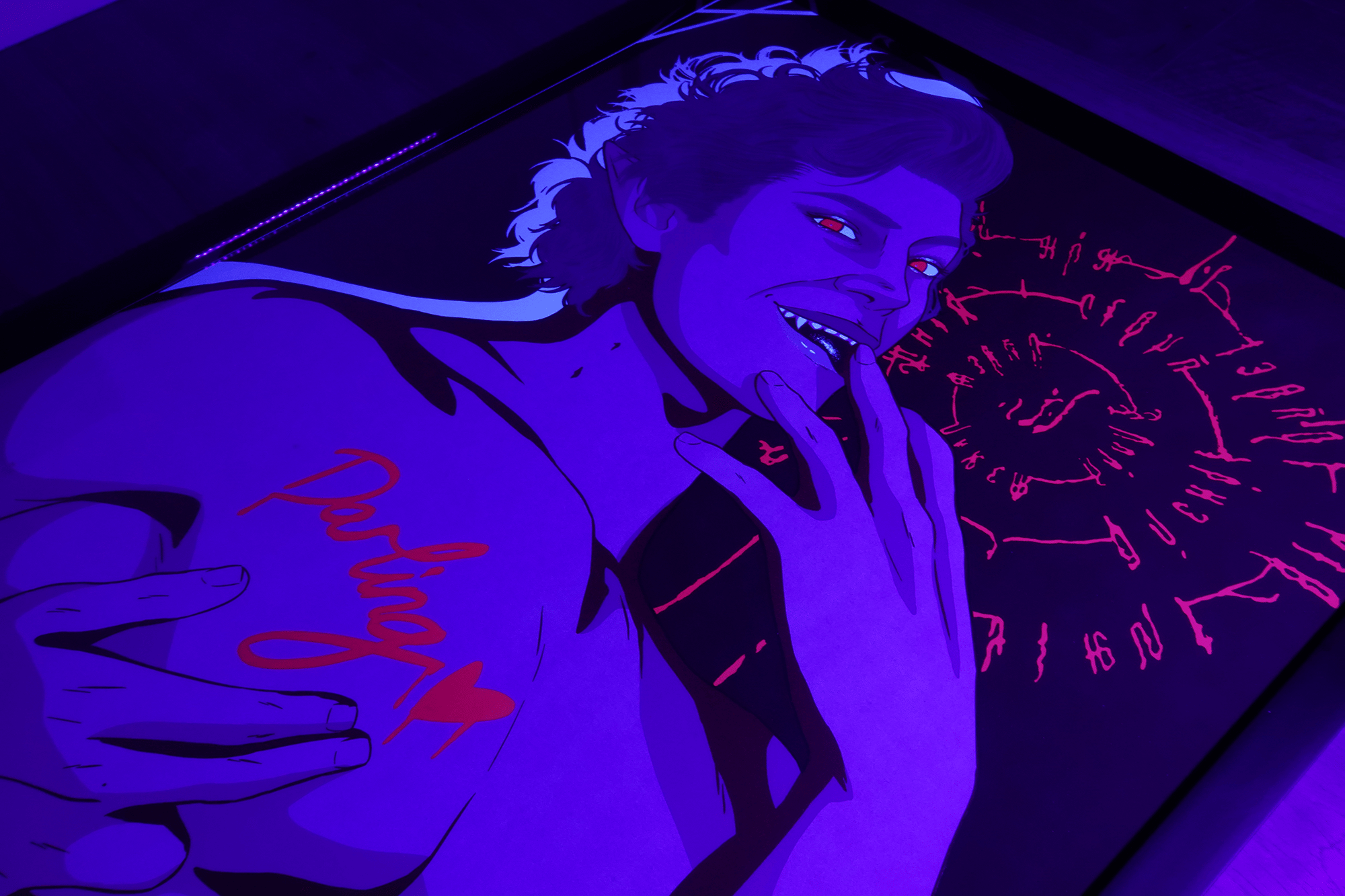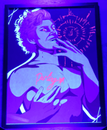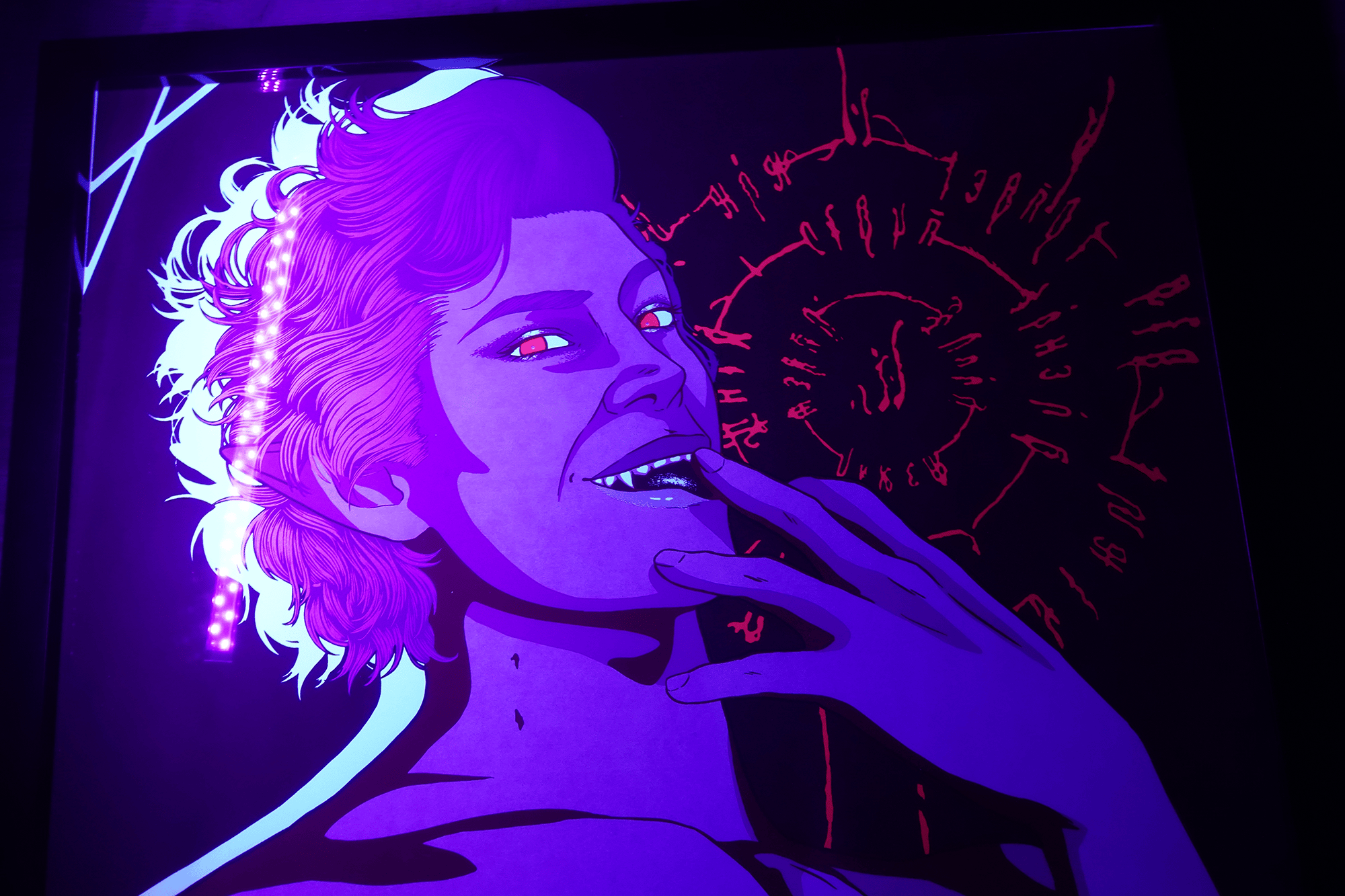 This print uses red fluorescent ink! You can use black light on this and it will glow red on select elements. Please review black light media.