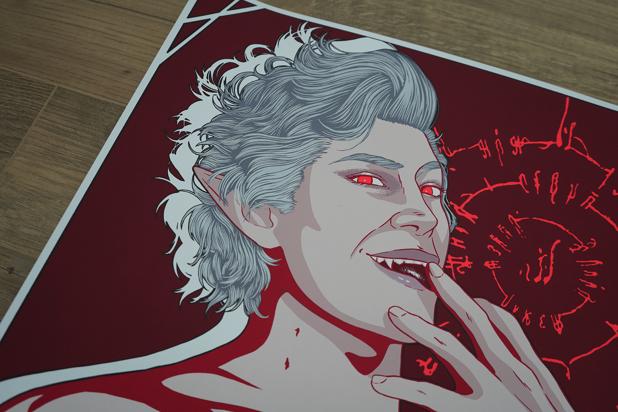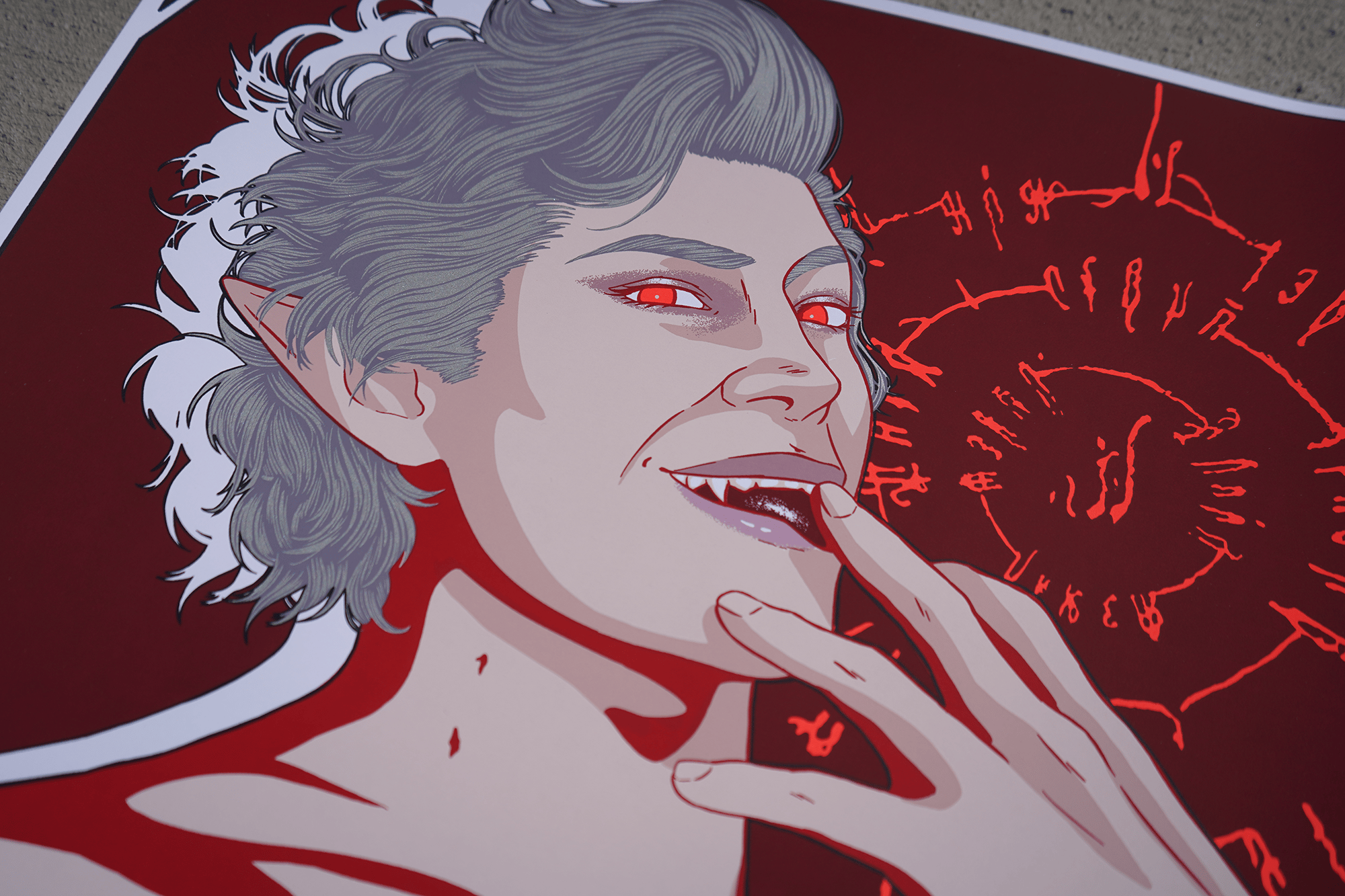 18"x24", 11-color screen print with gloss, metallic and fluorescent inks on 100lb Cougar White paper. Signed and numbered. Limited Edition of 210. Art by Scarstarion aka Scar. Printed by Night Swim in USA.